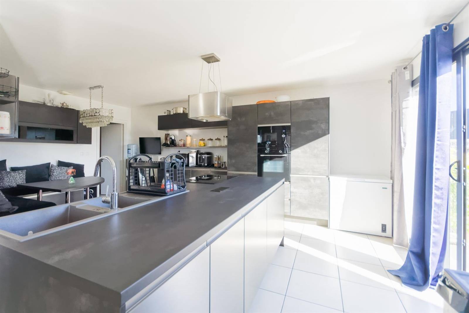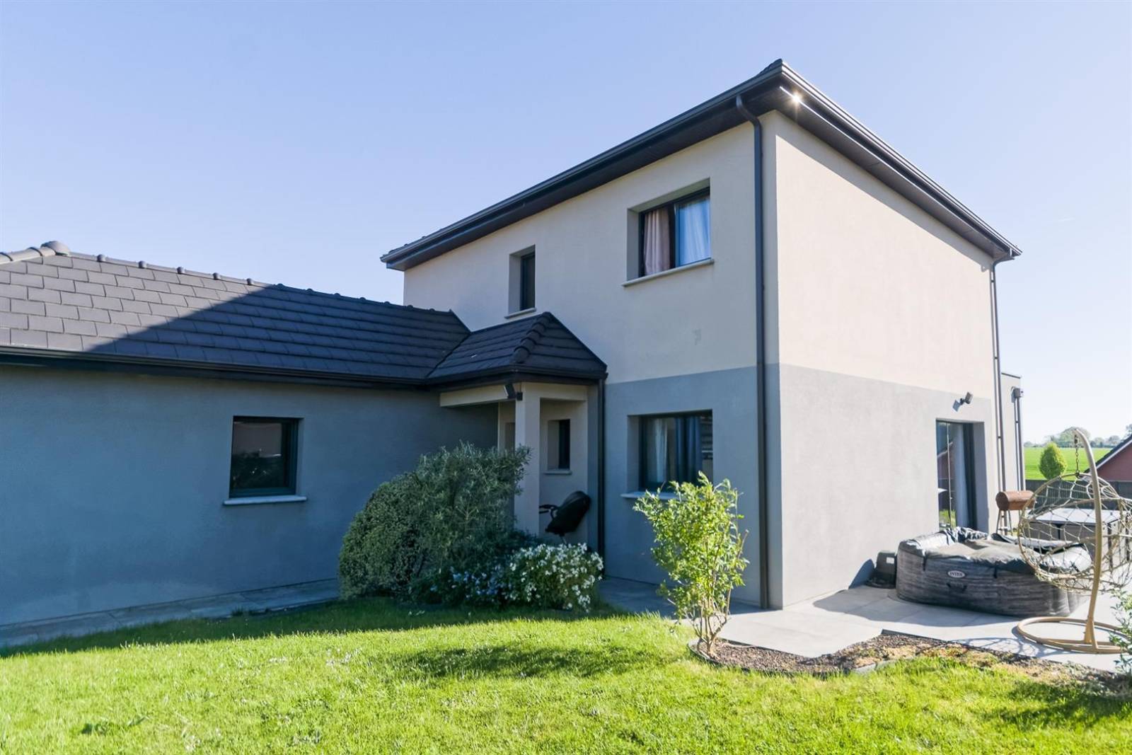 Beau VOLUME comprenant entrée, cuisine aménagée-équipée ouverte sur VASTE et LUMINEUX séjour-salon 60m² avec poêle à granulés, 3 chambres dont une SUITE PARENTALE avec dressing et salle de douche, salle de bain, 2wc, GARAGE, jardin sur parcelle de terrain 450m².
